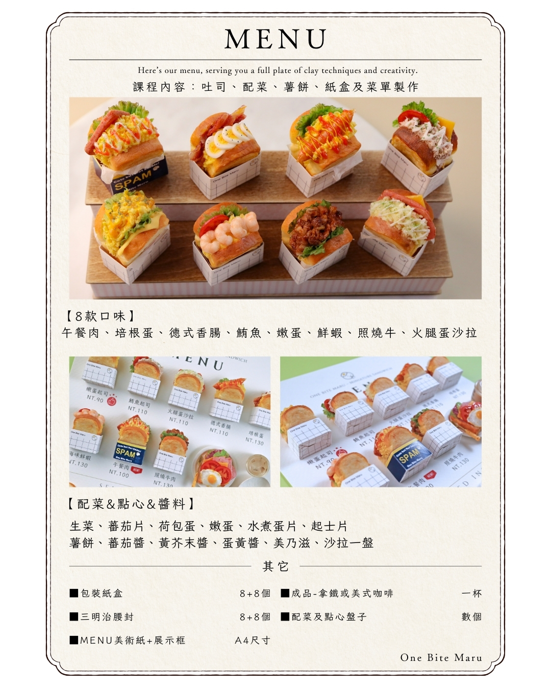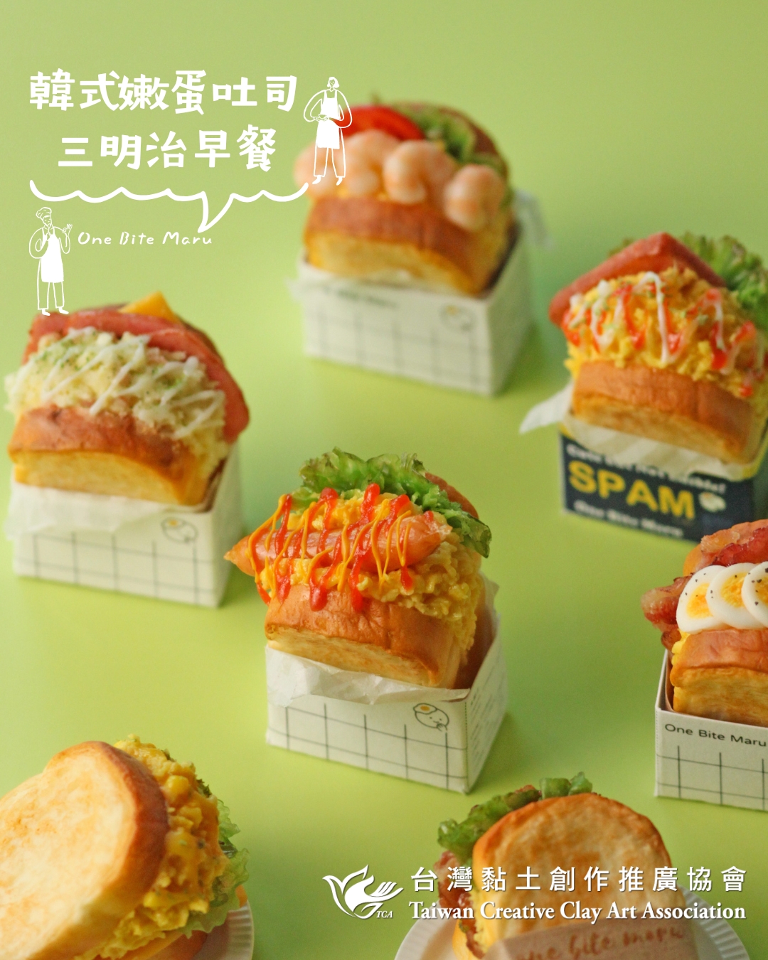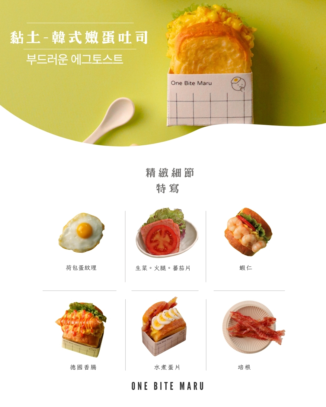 課程簡述 | 以韓國人氣 Eggdrop 早餐三明治為創作靈感 由Marugo 老師推出全新小食品牌〈One Bite Maru〉 用黏土做出 8 款鬆軟嫩蛋吐司 包裝、菜單都能親手完成 吐司尺寸約 2 × 3 cm,小巧卻充滿細節 One Bite Maru ,一口大小的美味時光 |