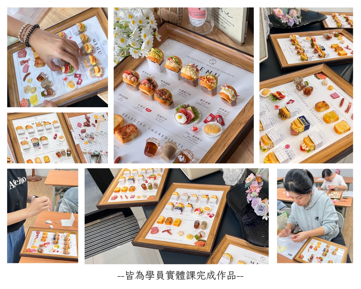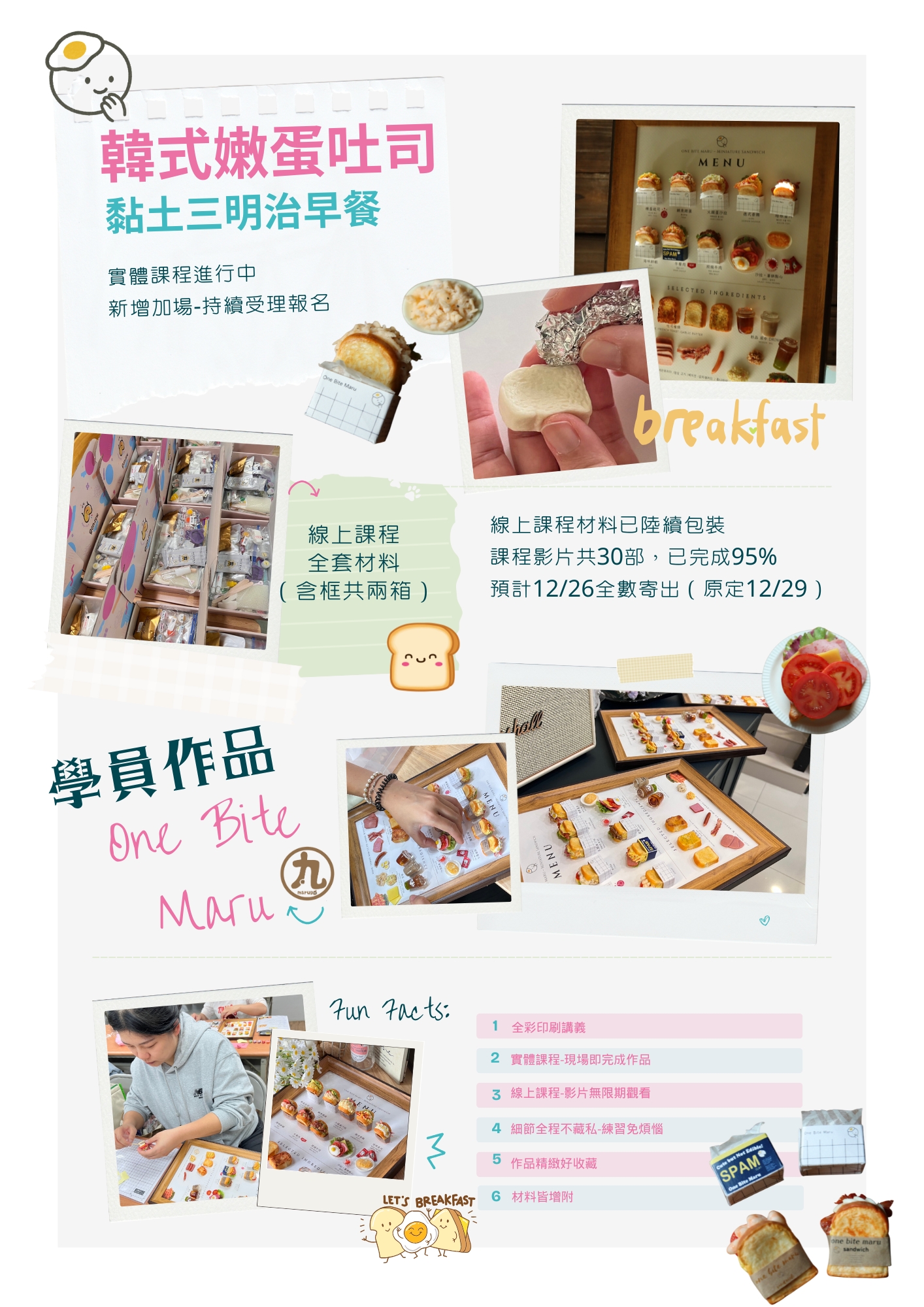 | 課程簡述 | 以韓國人氣 Eggdrop 早餐三明治為創作靈感 由Marugo 老師推出全新小食品牌〈One Bite Maru〉 用黏土做出 8 款鬆軟嫩蛋吐司 包裝、菜單都能親手完成 吐司尺寸約 2 × 3 cm,小巧卻充滿細節 One Bite Maru ,一口大小的美味時光 |