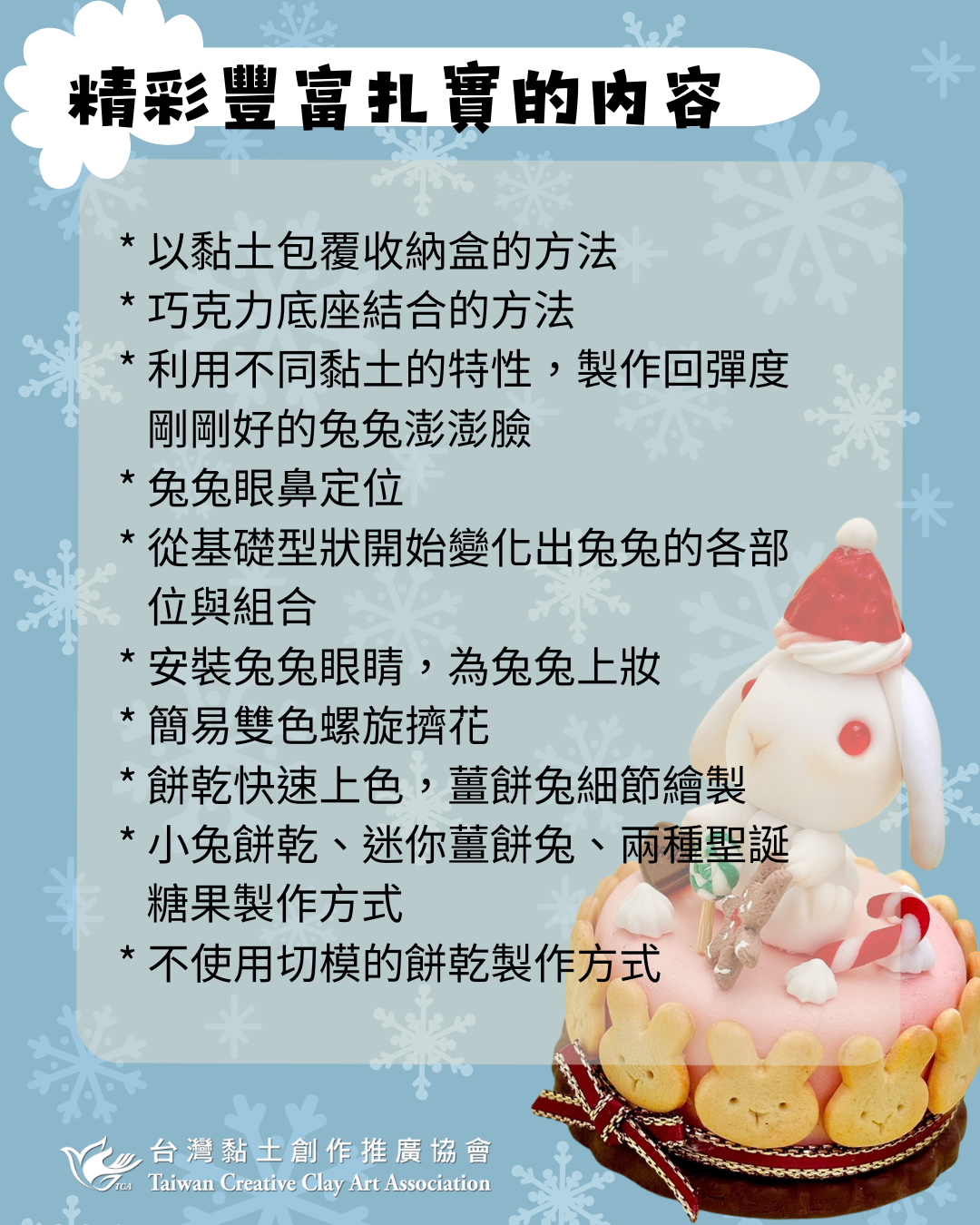 | 課程簡述 | 精心設計的課程,融入滿滿細節 與實用技法,陪你一步步完成超 萌的聖誕兔兔,讓這個冬季多一 份溫暖與驚喜⛄ |