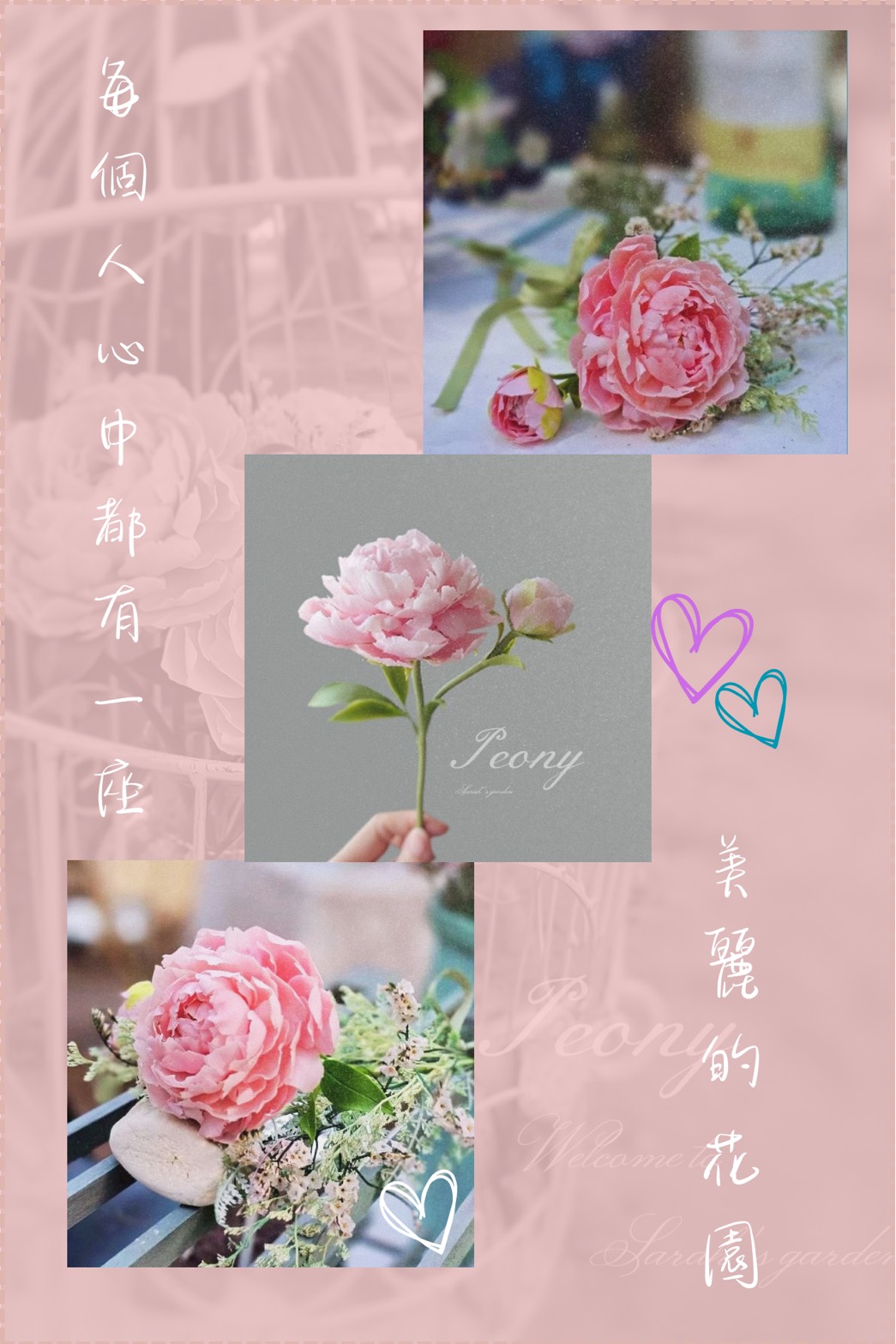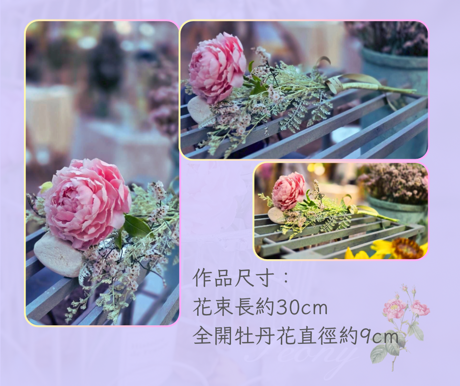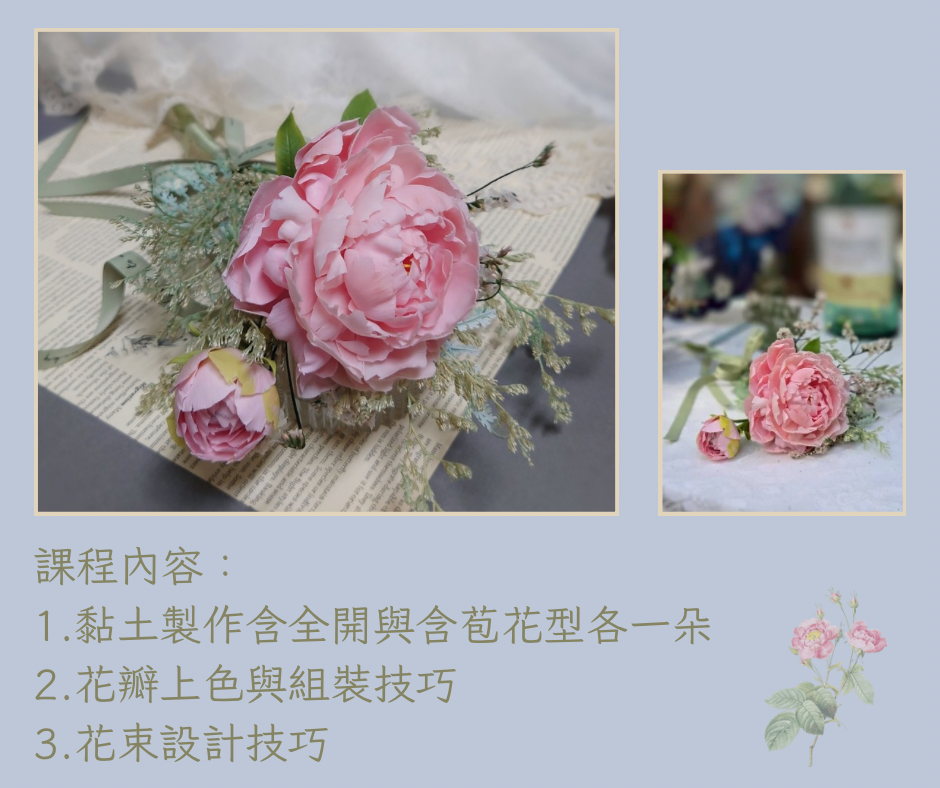 | 課程簡述 | 2026推出的黏土花藝研習課 挑選了牡丹花作為首波登場的主角 每個人心中都有一座美麗的花園 就讓這優雅的粉色牡丹 化作浪漫與幸福的仙子 迎接即將來臨的春天 作品尺寸:花束長約30cm,全開牡丹花直徑約9cm |