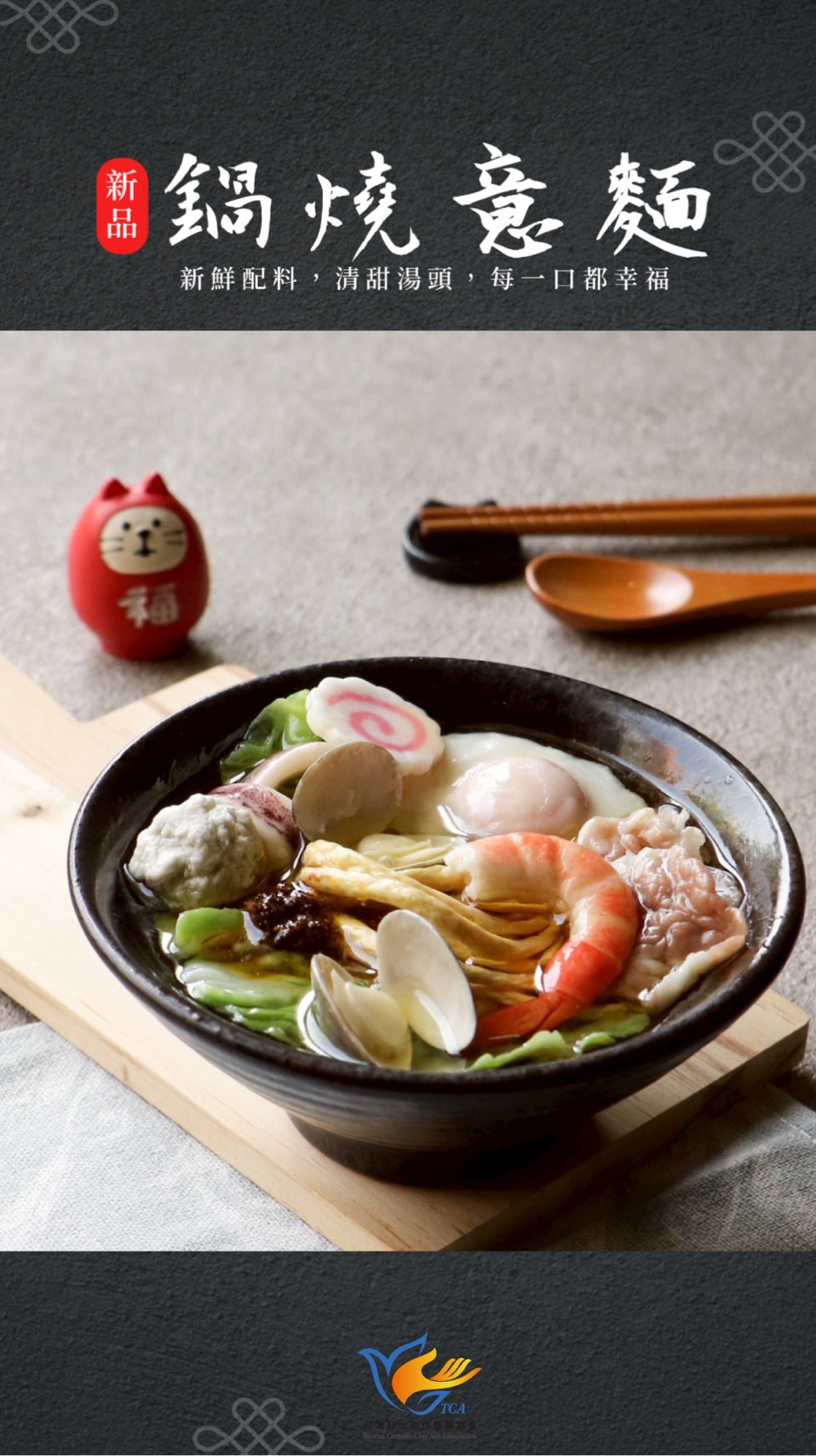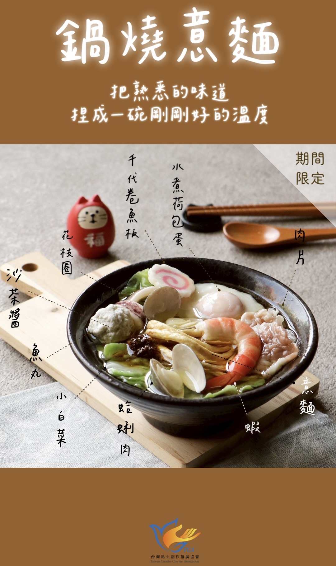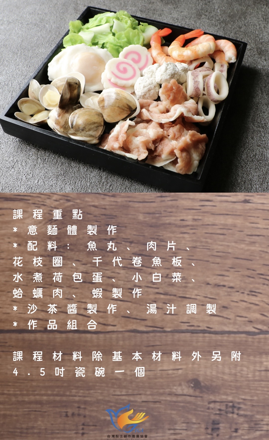 | 課程簡述 | 每個人從小到大必吃過的美食。 熱熱的一碗,簡單的湯底與隨個人喜好的麵體、配料,還有不能忽略的靈魂醬料沙茶醬。 以上用黏土擬真的將相關食材捏塑並組合,想必製作過程會讓人口水直流。 |